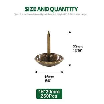 Show moreEnhance your décor and secure your treasured keepsakes with the Keadic 250Pcs Antique Upholstery Tacks Assortment Kit. Designed for those who appreciate both aesthetics and functionality, this kit features an exquisite bronze finish that exudes a vintage charm, perfect for upholstery and decorative projects. At a size of 5/8 inches in diameter, these nails are not only stylish but also robust enough to provide extra durability to your furniture. Each nail promises to elevate your chairs, sofas, and beds, making them not just more beautiful but also stronger and longer-lasting.