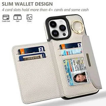 Keallce Wallet Case for iPhone 14 Pro 6.1'', Flip Case with Card Slots, Ring Holder Kickstand, PU Leather Protective Folio Cover for Women, Beige