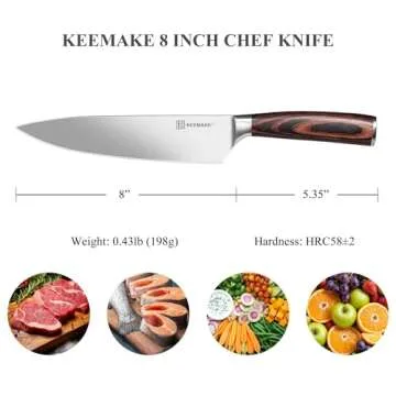 Show more This impressive chef's knife from KEEMAKE is crafted with precision using high carbon stainless steel, ensuring that it remains sharp and rust-resistant for years to come. Measuring an optimal 8 inches, this knife is designed to be your go-to tool for a variety of cooking tasks. Whether you're chopping vegetables, slicing meat, or dicing fruits, the blade's exceptional sharpness makes the job easy and enjoyable. What sets this knife apart is its multi-functional capability, allowing it to adapt to any kitchen endeavor, whether you're cooking a casual dinner or preparing a grand feast.