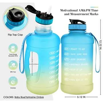 Show moreStay hydrated and motivated with the KEEPTO 64 oz Water Bottle – your ultimate companion for daily hydration! Designed for those who lead an active lifestyle, this BPA-free motivational gallon water jug features a sleek Tartrazine/Sky Blue Ombre design that not only looks great but also serves as a functional time tracker to help you reach your hydration goals throughout the day. With a generous 64-ounce capacity, you'll have ample water to fuel your workouts, workdays, or outdoor adventures.