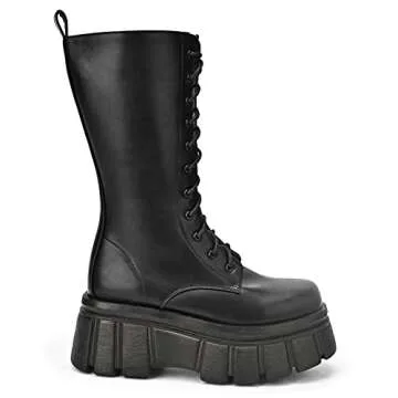 KEIIYJ Women's Black Combat Boots, Mid Calf Lace-Up Chunky Zip Platform Leather Boots 10