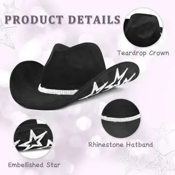 Keilin Cowgirl Hat Star Studded Rhinestone Cowboy Hat Disco Cowgirl Outfit Western Nashville Bachelorette Party Hat for Teens and Adults (Black)