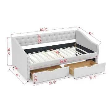 KELRIA Twin Size Upholstered Daybed with Two Storage Trundle Drawers, Wooden Sofa Bed w/Button Tufted Backrest and Waved Shape Arms, No Box Spring Needed, for Living Room, Bedroom, Dorm, Beige