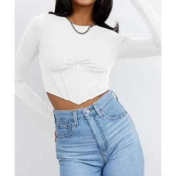 Kelyne Women Ribbed Long Sleeve Party Going Out Crop Tops for Women Cute Corset Cropped Sexy Fall Shirts White