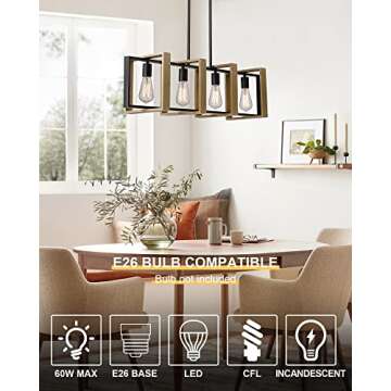 Ken & Ricky 36 inch Farmhouse Chandelier, Rustic Dining Room Light Fixture, 4-Light Kitchen Island Lighting Pool Table Pendant Light, Solid Wood and Metal Frame