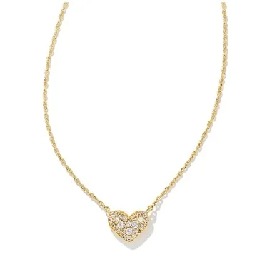 Show more Discover the enchanting Kendra Scott Ari 14k Gold-Plated Brass Pavé Crystal Heart Necklace in White Crystal, a remarkable jewelry piece that embodies both elegance and charm. Crafted with precision, this stunning necklace features a delicate metal chain that gracefully showcases its dainty heart-shaped pendant, adorned with mesmerizing pavé crystals that glimmer beautifully in the light. With dimensions of 0.39 inches in length and 0.28 inches in width, this pendant strikes the perfect balance between daintiness and visibility, making it suitable for everyday wear or special occasions alike.