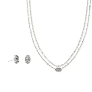 Show more Introducing the stunning Kendra Scott Gift Bundle, featuring the elegant Emilie Stud Earrings and a versatile Multi-Strand Necklace. This exquisite set is crafted to elevate your ensemble no matter the occasion. The earrings, measuring a delicate 0.25 inches in length and 0.20 inches in width, offer a subtle yet impactful sparkle, while the necklace showcases a 0.25 inch by 0.20 inch station on a chic 15.5-inch chain with an added 3-inch extender for adjustable comfort. Both pieces are beautifully rhodium-plated and feature the captivating Platinum Drusy, guaranteed to shine and enhance your style whether you’re dressing up for a special event or going for a more casual look.