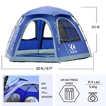 The KENFOR tent incorporates thoughtful design elements, such as a mesh skylight at the top for excellent ventilation and two enlarged D-shaped windows, ensuring you enjoy fresh air while minimizing pesky mosquito intrusions. Focused on details, this tent is ideal for a multitude of outdoor activities, including camping, hiking, fishing, beach outings, outdoor barbecues, and family gatherings.