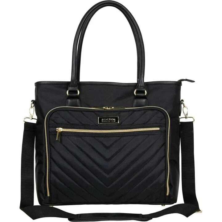 The Kenneth Cole Reaction Quilted Chevron Laptop & Tablet Business Tote stands out due to its numerous features. The polyester twill exterior with chevron quilted detail ensures aesthetic appeal, while the fully lined interior offers durability. Padded pockets for laptops and tablets safeguard your electronics, and multiple internal and external compartments offer organizational efficiency. The trolley strap adds a layer of convenience for travelers.