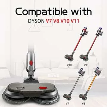 Show moreIntroducing the KENVOR Electric Mop Head, the ultimate attachment designed specifically for Dyson vacuum cleaners (V7, V8, V10, and V11 models). This innovative electric mop simplifies your cleaning routine by combining vacuuming and mopping capabilities into one effortless tool. With a sleek design that seamlessly integrates with your Dyson, it not only enhances your existing cleaning equipment but also provides a thorough yet gentle clean on hard surfaces. The mop head features a high-powered dual-spin motor that operates at an impressive 150 RPM/min, allowing you to quickly tackle stubborn grime on hardwood, vinyl, and ceramic tile floors. Equipped with LED headlights, you can easily spot dirt and stains, ensuring no area is left uncleaned. Plus, it comes with six reusable mop pads made of durable nanoscale nylon cloth that are not only effective but also environmentally friendly.