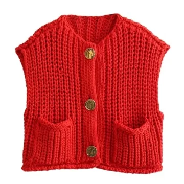 Show moreIntroducing the stylish must-have for your seasonal wardrobe: the KEOMUD Women Sleeveless Crop Knit Cardigan Vest. This vibrant red chunky knit vest is not only a visual delight but also crafted from premium, skin-friendly fabric that feels soft against your skin. Designed to be both lightweight and breathable, this cropped sweater vest transitions seamlessly from spring to summer, making it an essential piece for your outfits. The unique button-up front and classic crewneck provide a flattering silhouette that flatters every figure.