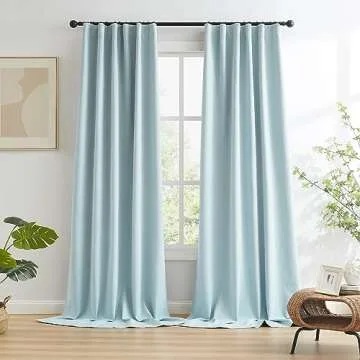 Show moreTransform your living spaces into serene sanctuaries with the KEQIAOSUOCAI Extra Long 108 Inch Full Blackout Curtains. Crafted from high-quality linen-textured fabric, these curtains are designed for both beauty and practicality, effortlessly blocking out 100% of unwanted light and harmful UV rays. This means you can enjoy complete darkness and privacy in any room, making them perfect for bedrooms, home theaters, and nurseries. The stylish light sky blue color compliments various decor styles, adding a touch of elegance to your ambiance while enhancing your home's aesthetic appeal.