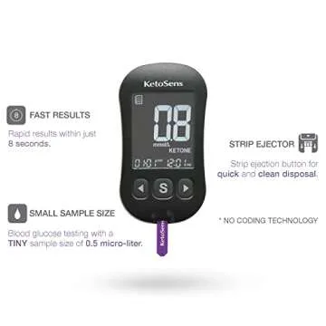 Show more If you're on a ketogenic diet and want to take your health seriously, look no further than the KetoSens Blood Ketone Monitor. This high-tech device is specifically designed for those who need to accurately measure their blood ketone levels, helping you stay on track with your nutritional goals. Forget about the hassle of complicated testing; with KetoSens, you'll be able to manage your blood ketone levels quickly and easily. It requires a remarkably small 0.5 microliter blood droplet and delivers precise results in a mere 8 seconds. This remarkable speed exceeds that of many competitors, who might need almost double the droplet size and a longer testing time.