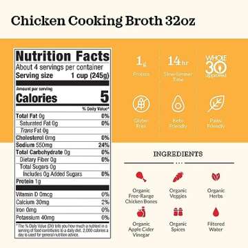 Show moreIntroducing the Kettle and Fire Organic Chicken Broth, the ultimate kitchen staple for health-conscious home chefs! Each 32oz carton is designed with a convenient flip-top lid that not only makes pouring a breeze, but also allows for hassle-free storage. With a total of about 4 servings per carton and each serving containing approximately 1 gram of protein and just 15 calories, our chicken broth is a nourishing blend that is perfect for enhancing your culinary creations.