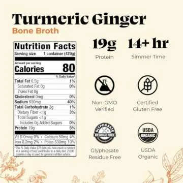 Show moreIntroducing the Kettle and Fire Turmeric Ginger Chicken Bone Broth, a delicious and nutritious addition to your pantry. This versatile broth is not just a meal starter, but a health-enhancing powerhouse! Crafted with care, it adheres to Keto, Paleo, and Whole 30 diets while being gluten-free and packed with an impressive 19g of protein per serving. Infused with the warming flavors of turmeric and ginger, this broth stands out for its rich, bold taste, making it the perfect companion for a variety of dishes or even as a warming beverage any time of day.