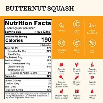 Show moreIndulge your taste buds with the exquisite Kettle & Fire Butternut Squash Soup, a delightful blend that brings the flavors of the harvest to your table. Each 16.9 oz package is meticulously crafted with premium butternut squash, ensuring a rich, creamy texture that will warm your soul and satisfy your cravings. Ideal for those seeking a wholesome meal option, this soup is not only delicious but also a wholesome addition to your diet. With an easy-to-use packaging that weighs just 1.1 pounds, you can enjoy a comforting bowl of soup both at home and on the go.