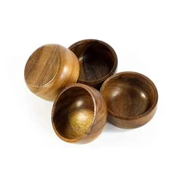 Show more Introducing the Kevin Home Small Wooden Serving Bowl, a stunning set of four beautifully crafted bowls that are perfect for elevating your kitchen experience. Each bowl measures 3 inches in diameter and 1.4 inches in height, offering a compact yet versatile size ideal for serving a variety of treats. Made from 100% Acacia hardwood, these bowls showcase a unique wood grain pattern that gives each piece its own charm and character. The natural color variations enhance their beauty and stand as a testimony to their artisanal craftsmanship.