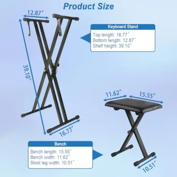 Show moreIntroducing the 2025 Upgrade Heavy Duty Double-X Keyboard Stand and Piano Bench Set by YIIZY – the perfect blend of versatility, stability, and style for music enthusiasts! Designed with meticulous attention to detail, this remarkable set features a high-quality piano stand and a comfortable bench, making it suitable for both beginners and professionals alike. With 7 adjustable heights for the keyboard stand, ranging from 12.48 to 37.68 inches, and 4 adjustable heights for the bench, you can effortlessly customize your playing experience whether sitting or standing. Its lightweight and portable design means you can take your music anywhere you go!