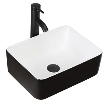 Show more Transform your bathroom with the KGAR Rectangular Bathroom Sink! This stunning above-counter vessel sink is constructed from high-quality, durable porcelain ceramic, providing you with long-lasting beauty and functionality. With a sleek white finish and a chic black faucet, this sink effortlessly elevates any bathroom or powder room’s aesthetic, making it not only a functional unit but a striking centerpiece.