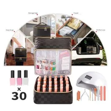 Show more If you're a nail art enthusiast or a professional nail technician, the KGMCARE Portable Nail Polish Organizer Bag is your new must-have accessory. Its chic checkered black design isn’t just about looks; measuring at 9" x 8" x 9.5", this compact case is engineered to meet daily storage needs while keeping everything you require for a flawless manicure organized and accessible. Featuring multiple zippered pockets and elastic bands, it can easily accommodate all your manicure tools—from vibrant polishes and glitter canisters to a UV lamp and cuticle removers. This means no more frantic searches for your favorite shade during your pampering sessions!
