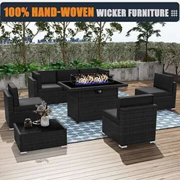 Show more Welcome to the ultimate outdoor experience with our exquisite fire pit sofa set, crafted for those who cherish comfort and style. This luxurious furniture set features ultra-durable All-Weather Wicker that is not only aesthetically pleasing but also built to endure the harshest elements. Whether it's the blazing sun or a pouring rain, the water-resistant and UV-resistant material ensures your outdoor decor remains pristine throughout the seasons. Enjoy the outdoors without worrying about damage, as this set is designed to withstand the test of time.