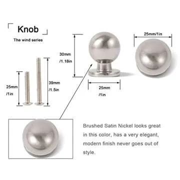 Show moreIntroducing the Khtumeware 20 Pack 1 Inch (25mm) Diameter Round Solid Ball Satin Nickel Kitchen Cabinet Knobs! These exquisite cabinet knobs combine style and functionality, perfect for anyone looking to elevate their home decor. Crafted with a solid ball design in a sleek satin nickel finish, these knobs provide a modern touch while ensuring durability and longevity. With Khtumeware’s commitment to quality, you can trust that these knobs will maintain their charm even in high-traffic areas like kitchens and bathrooms. Installation is effortless, making these knobs an ideal choice for DIY enthusiasts and professionals alike.