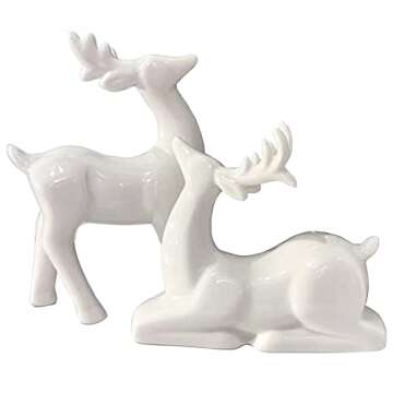 Show moreBring the warmth and charm of the holiday season into your home with the KiaoTime Porcelain Christmas Reindeer Decorations. Perfectly sized for any holiday decor setup, this exquisite set features a standing reindeer measuring 5.25 inches in height and a sitting deer at 3.5 inches, both designed in an elegant all-white ceramic finish. Each piece is meticulously crafted, showcasing delicate craftsmanship and a solid structure that guarantees both beauty and durability. The minimalistic yet sophisticated style ensures these decorations seamlessly enhance any festive space, making them ideal for Christmas, New Year, or even as delightful birthday gifts.