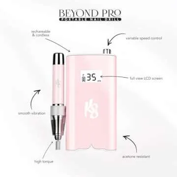 Show moreIntroducing the Kiara Sky Beyond Pro Portable Nail Drill in stunning pink – an essential and revolutionary tool for anyone passionate about nail care. This professional e-file system combines state-of-the-art design with functionality, providing a powerful yet quiet operation that sets it apart from traditional nail drills. Say goodbye to the noisy, bulky machines of the past! With its sleek, lightweight body and cordless capabilities, you can achieve flawless nails anywhere, anytime. The battery life lasts up to 10 hours, ensuring you have all the time you need to create stunning nail designs without the hassle of frequent recharging. Designed with beauty in mind, the Beyond Pro not only performs like a champion but also adds a touch of elegance to your nail collection.