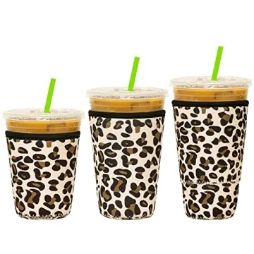 Kiatoras 3 Pack Reusable Iced Coffee Sleeve Neoprene Insulator Sleeve for Iced Coffee Cups or Cold Beverages Cups (Leopard)