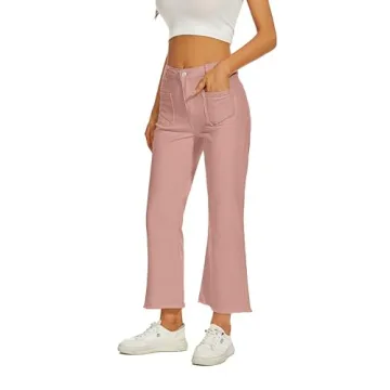 KICZOY Women Straight Leg Capris Jeans Mid Rise Cropped Pants Stretchy Ankle Length with Pockets Pink