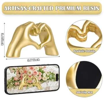 Show moreIntroducing the KIDHABE Gold Decor Heart Hands Sculpture, a beautifully crafted accent piece that transcends mere decor, adding an essence of love and elegance to any space. Designed for versatility, this modern sculpture is handmade from high-quality resin, ensuring both durability and a luxurious look that captures the eye and warms the heart. Its semi-realistic design features intricate details, including perfectly crafted nail lines, bringing an artistic flair to your living room, bedroom, or any personal space. At just 5.71 inches in size, it is a delightful addition to bookshelves, desks, and mantles without overwhelming your setup. This charming piece doubles as a bracelet holder, combining functionality with beauty, making it an essential decor item for anyone looking to showcase their favorites while maintaining a stylish aesthetic.
