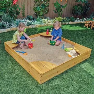 KidKraft Wooden Backyard Sandbox with Built-in Corner Seating and Mesh Cover, Kid's Outdoor Furniture, Honey, Gift for Ages 2-8