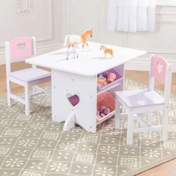 KidKraft Wooden Heart Table & Chair Set with 4 Storage Bins, Children's Furniture – Pink, Purple & White, Gift for Ages 3-8