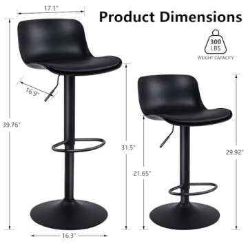 Show moreExperience unparalleled sophistication with the Kidol & Shellder Black Bar Stools Set of 2, designed to elevate your kitchen, dining room, or bar area. These adjustable counter height bar stools blend modern aesthetics with functional design, making them an essential addition to any contemporary space. Finished in high-quality PU leather, these stools not only boast a trendy black appeal but also promise durability and ease of maintenance. The soft, high-density sponge upholstery molds to your body, ensuring maximum comfort while providing a striking look that complements your decor.
