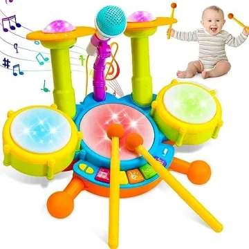 Show moreIntroduce your child to a magical world of rhythm and sound with the Kids Drum Set for Toddlers, an extraordinary musical toy designed for boys and girls ages 1 to 3. This vibrant ensemble is a delight for little musicians, featuring 3 drum pads, 2 ride cymbals, and a microphone that together create an enchanting auditory experience. With its bright colors and captivating lights, this drum set does more than just entertain; it fosters motor skills and self-expression in the cutest possible way.