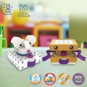 Show more This interactive learning toy is a fantastic introduction to the world of coding and robotics for children in grades K-2. With no need for software, apps, or smart devices, this kit encourages hands-on learning while making coding accessible and exciting! Your child will embark on a delightful journey through six different storylines, each presenting a range of model-building and coding challenges, from navigating a mouse through a maze to scoring a goal in soccer.
