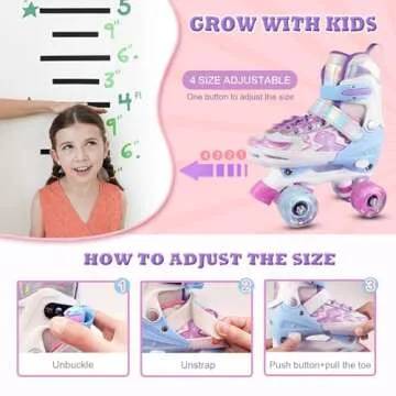 Show moreIntroducing the PLIIMONA Kids Roller Skates, the perfect blend of fun, comfort, and practicality for young skaters aged 3-12! These skates are thoughtfully designed with an innovative **4-size adjustable feature**, ensuring that as your child grows, the skates can grow with them. No need to frequently replace skates as your little one's feet expand; these versatile skates are built to last! The bright colors and playful design not only appeal to kids but also enhance visibility for safety during outdoor and indoor adventures.
