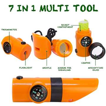 The 7 IN 1 MULTI TOOL is another standout feature that includes a FLASHLIGHT, a MIRROR for signaling, a MAGNIFYING GLASS, a WHISTLE for quick location, a THERMOSTAT, a COMPASS, and a SECRET COMPARTMENT to spark imagination further. The set's binoculars offer 5x30 magnification with rubber eye pieces, ensuring children's eyes are protected while they enjoy up-close views of nature. These shock-resistant binoculars are ergonomically designed for small hands and come with a lanyard and protective case. Kids can use them for hours of carefree outdoor fun.