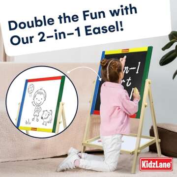 Show more Introducing the Kidzlane Art Easel for Kids, a captivating 2-in-1 creative station designed specifically for toddlers aged 2 to 4 years old. This multifunctional wooden easel features both a blackboard and a dry erase board, providing endless artistic opportunities that encourage your child’s imagination and creativity. Built with a sturdy wooden frame, this easel is not only safe and durable for small hands, but it also includes a convenient tray for storing art accessories, ensuring that everything needed for play is within easy reach. With dimensions of 25.75 inches, this standing easel is the perfect height for young artists, fostering independence as they explore their creative side.