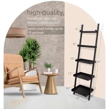 Kiera Grace Providence Hadfield 5 Tier Ladder Shelf Modern Leaning Bookshelf Storage Rack for Home, Office, 18" x 67", Black