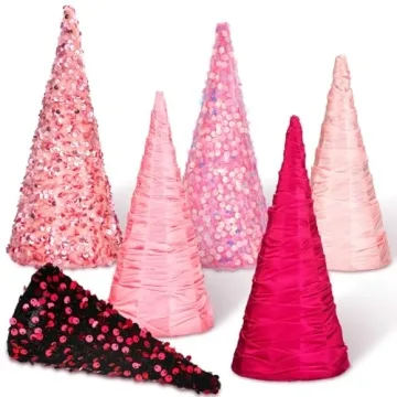 Show more Transform your home this Valentine’s Day with the captivating Kigley 6 Pcs Pink Valentine Day Tree Cone Decor, a luxurious collection designed to enrich your celebrations. This exquisite set features six stunning cone decorations in a beautiful gradient of vibrant pinks, perfect for creating a whimsical yet romantic atmosphere. Each piece is carefully crafted from high-quality materials, seamlessly combining soft cloth and glitter cloth to bring elegance and charm to any setting. Available in three distinct sizes—large, medium, and small—these versatile decorations cater to all your decorating needs, ensuring a delightful display whether you’re aiming for grand aesthetics or charming subtleties.