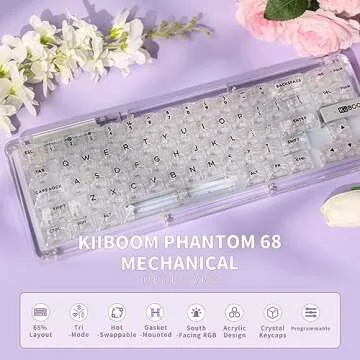 Show more The KiiBOOM Phantom 68 is not just a mechanical keyboard, it’s a complete transformation of your typing experience! Designed with a sleek 65% layout, this keyboard features a remarkable gasket-mounted structure that minimizes noise and maximizes comfort. Its stunning transparent acrylic build not only enhances the aesthetics but also allows for mesmerizing RGB lighting effects that will light up your workspace. What sets the Phantom 68 apart is its hot-swappable mechanical keys, letting you customize your keyboard just the way you like it without needing replacement.