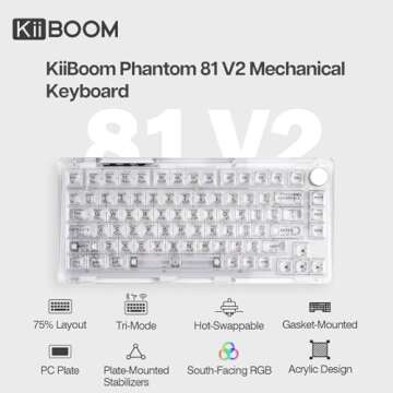 KiiBoom Phantom 81 V2 75% Hot Swappable Upgraded Crystal Gasket-Mounted Mechanical Keyboard, Triple Mode NKRO Gaming Keyboard with South-Facing RGB, Clear Keycaps, 4000mAh Battery for Win/Mac (Clear)