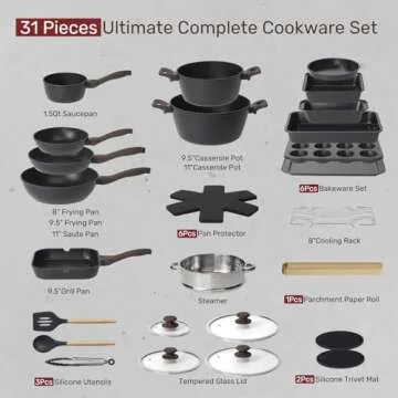 Kikcoin 31 Pcs Kitchen Cookware Set, Non Stick Pots and Pans Set Bakeware Set Nonstick Cooking Set with Baking Pans, Frying Pans, Saucepan, Grill Pan, Utensils