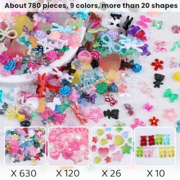 Kikonoke 3D Nail Charms Set 9 Colors Flower Butterfly Bow Rabbit Nail Gems Big Bear and Heart Nail Jewels Pearls for Nail Art, Craft and Decoration with Glue Gel, Tweezer and Brush