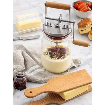 Show more The Kilner Butter Churner is a delightful kitchen gadget that allows you to create delicious, homemade butter in the comfort of your own home. Crafted by the iconic brand Kilner, this butter churner includes everything you need to start churning right away—a 1-litre glass jar, a dedicated churning mechanism, and a handy recipe booklet. Transforming double cream into rich, creamy butter has never been easier; simply attach the lid, turn the handle, and watch as the paddles churn and blend your cream into buttery perfection within minutes.