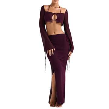 Show more Introducing the stunning two-piece skirt outfit for women, crafted from high-quality polyester fabric that is both skin-friendly and flexible, ensuring ultimate comfort for any occasion. This chic ensemble features a button square neck long sleeve crop top that beautifully complements the high-waisted, split long skirt, creating a stylish silhouette that flatters all body types. With its sexy temperament and solid color design, this outfit is perfect for making a fashionable statement wherever you go.