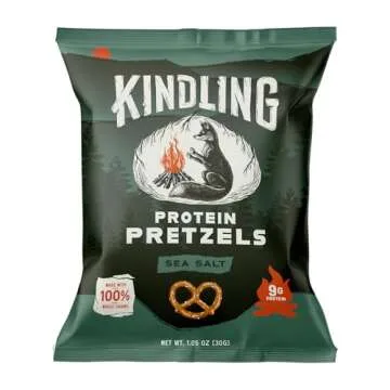 Kindling Protein Pretzels - Sea Salt | Protein-Packed Snack Size Bags | Kosher | 8-9g Protein Per Serving | Only 1-2g of Total Sugar | No Artificial Flavors, Soy-Free | Lunches, Office Snacks, & On-the-Go | 16-Count (1.06oz Bags)