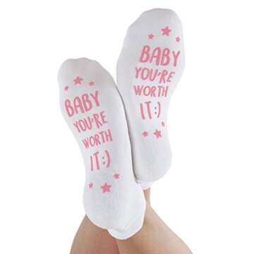 Show moreStep into a world of comfort and empowerment with the Kindred Bravely Labor and Delivery Inspirational Fun Non Skid Push Socks. Crafted from a luxurious blend of cotton, polyester, and spandex, these socks are designed to keep your feet warm and cozy during the challenging yet unforgettable moments of motherhood. The fabric's softness combined with its stretchable quality ensures a snug fit that accommodates every movement you make. Key to their appeal is the reinforcement at the toe, assuring you a level of durability that is essential for everyday wear. With a vibrant pink hue adorned by the motivating phrase "Baby You're Worth It!", these socks serve not only as functional wear but also as daily affirmations to bolster your spirit throughout pregnancy and postpartum.