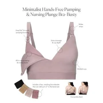 Show moreDiscover the ultimate balance of comfort and versatility with the Kindred Bravely Minimalist Hands Free Busty Pumping Bra. Specifically designed for women with larger bust sizes (F, G, H, and I cups), this innovative bra combines a chic style with essential functionality, allowing you to seamlessly transition from nursing to hands-free pumping. Made from ultra-soft fabric, it features a sleek neckline and fixed padding, making it ideal for everyday wear. The thoughtful construction ensures not only comfort but also the perfect fit, whether you choose to wear it under a uniform or stylish top.
